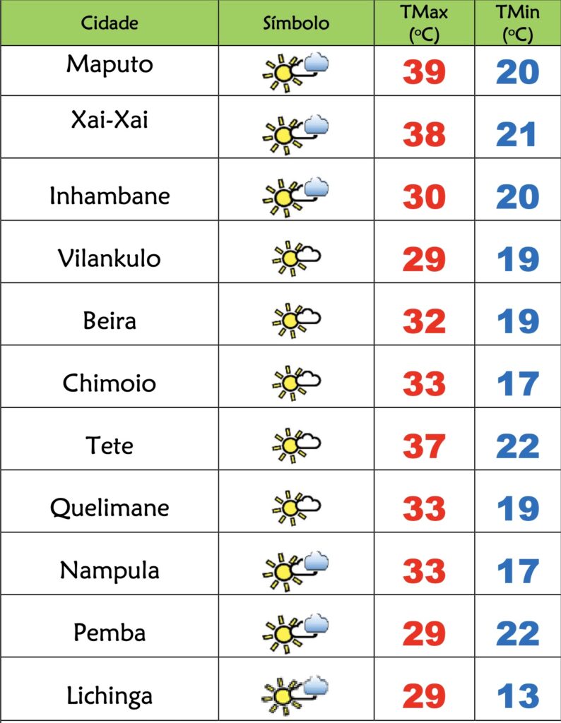 O Instituto Nacional de Meteorologia(INAM) prevê tempo quente a muito quente e húmido(calor intenso), com temperaturas máximas que poderão variar de 38 à 42 graus celsius, nesta terça-feira(16) nos distritos de Matutuine, Namaacha, Boane, Moamba, Magude, Manhiça, Marracuene e cidades de Maputo e Matola(Província de Maputo); nos distritos de Massingir, Chókwe, Chonguene, Bilene, Limpopo, Mandlakazi, Chicualacuala, Mapai, Massangena, Mabalane, Chigubo, Chibuto , Guijá, Macia e cidade de Xai-Xai(Província de Gaza); e nos distritos de Zavala, Inharrime, Jangamo, Panda e Homoíne(Província de Inhambane).