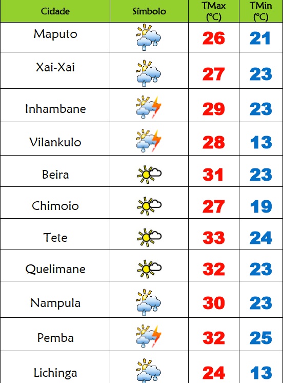 Nas províncias de Inhambane, Gaza e Maputo o INAM prevê céu predominantemente nublado; Períodos de chuvas fracas intermitentes em Maputo e Gaza, podendo ocorrer em regime moderado em Inhambane; Vento de variável, soprando de nordeste com intensidade fraca a moderada.