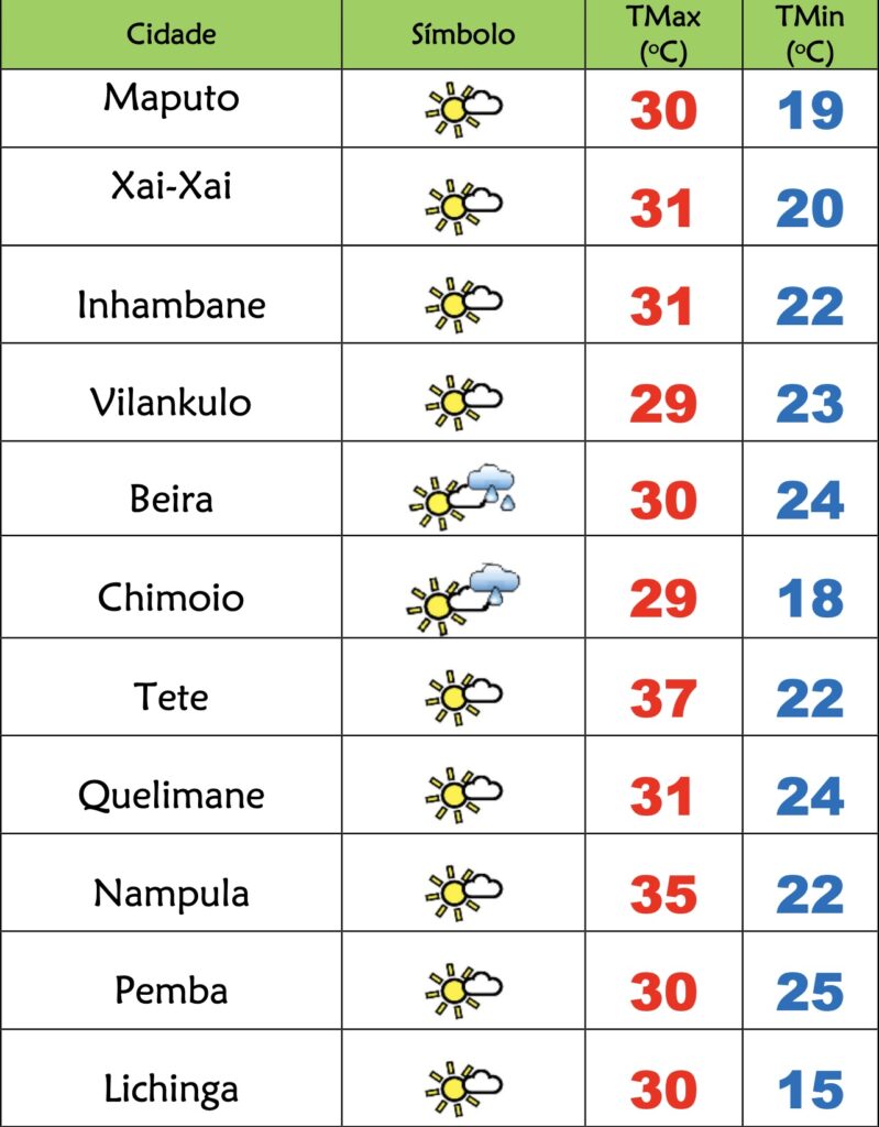 O Instituto Nacional de Meteorologia(INAM) prevê o seguinte estado do tempo para esta terça-feira(04), 1276 dia em Emergência de Saúde Pública em Moçambique: nas províncias de Niassa, Cabo Delgado e Nampula céu pouco nublado passando a muito nublado; Aguaceiros com trovoadas e chuvas fracas podendo ocorrer em regime moderado a forte no sul da província de Niassa; Vento de nordeste a leste fraco a moderado.