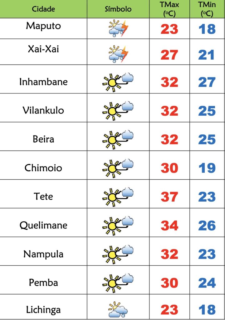 Nas províncias de Inhambane, Gaza e Maputo o INAM prevê céu geralmente nublado nublado, chuvas locais fracas a moderadas que podem ser acompanhadas de trovoadas; Vento de nordeste a noroeste, temporariamente de sueste em Maputo, fraco a moderado soprando por vezes com rajadas principalmente na faixa costeira.