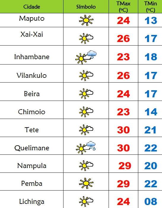 Para as províncias de Tete, Zambézia, Manica e Sofala está previsto céu pouco nublado localmente muito nublado, possibilidade de chuviscos locais; Neblinas e nevoeiros, principalmente ao longo dos vales; Vento de sudoeste a sueste fraco a moderado.