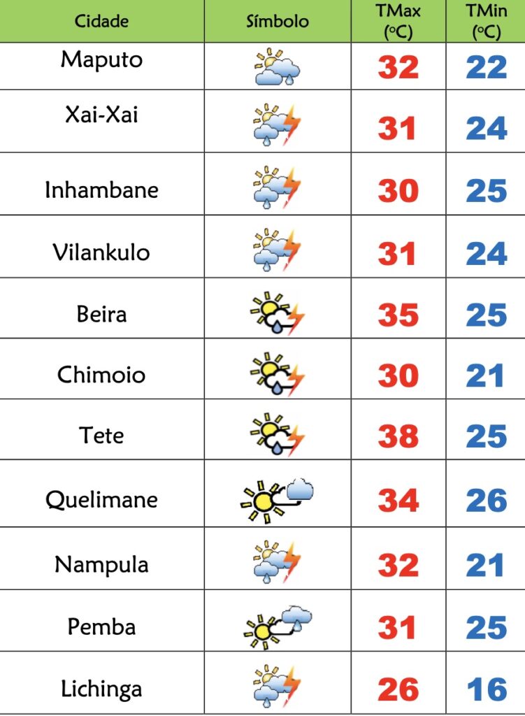 Para as províncias de Tete, Zambézia, Manica e Sofala está previsto céu pouco nublado localmente muito nublado, chuvas fracas localmente moderadas acompanhados de trovoadas principalmente em Manica e Sofala; Vento de sueste a leste fraco a moderado, soprando por vezes com rajadas.