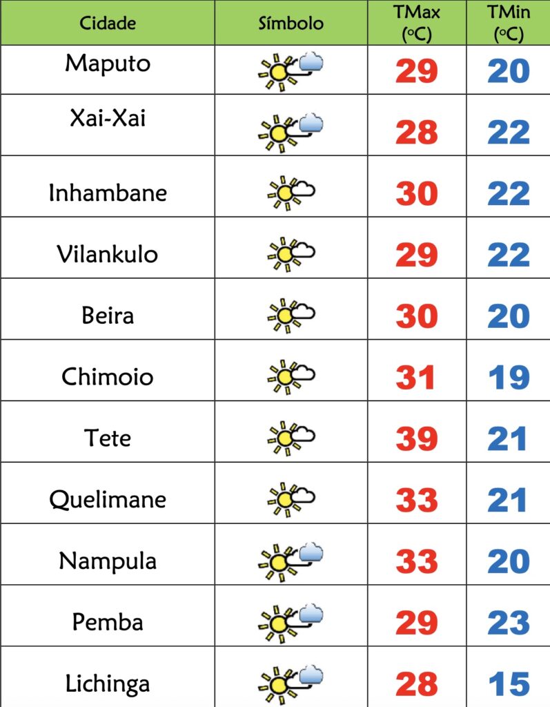 Para as províncias de Tete, Zambézia, Manica e Sofala está previsto céu geralmente pouco nublado; Possibilidade de neblina e nevoeiro locais; Vento de nordeste a sueste, fraco a moderado.