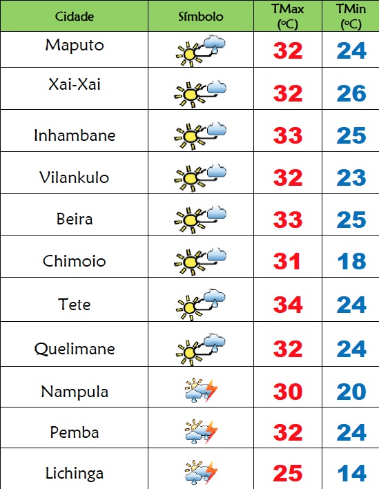 Nas províncias de Inhambane, Gaza e Maputo o INAM prevê céu pouco nublado temporariamente nublado; Possibilidade de chuviscos locais ao longo da faixa costeira; Vento de nordeste fraco a moderado, rodando para sueste por vezes com rajadas.