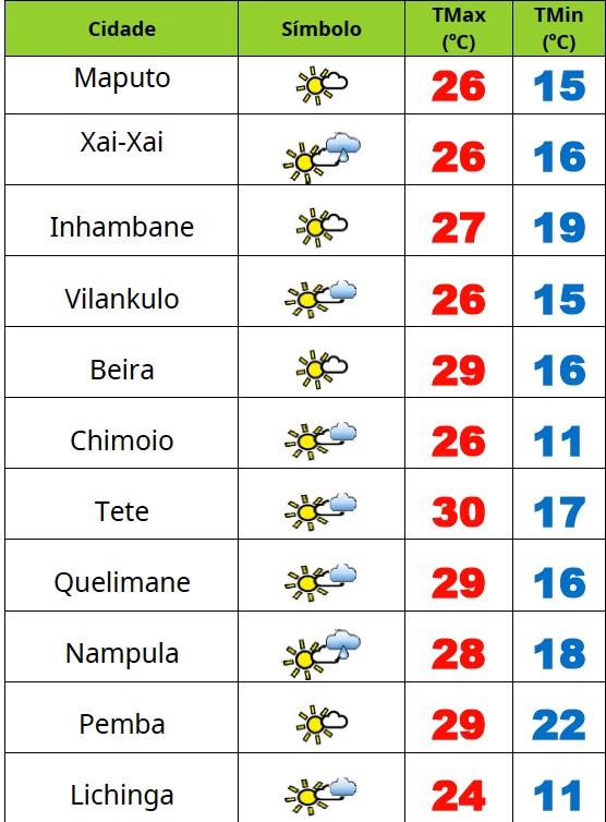 Para as províncias de Tete, Zambézia, Manica e Sofala está previsto céu limpo, sendo pouco nublado na província da Zambézia; Ocorrência de neblinas ou nevoeiros matinais; Vento de sueste, temporariamente de nordeste fraco a moderado.
