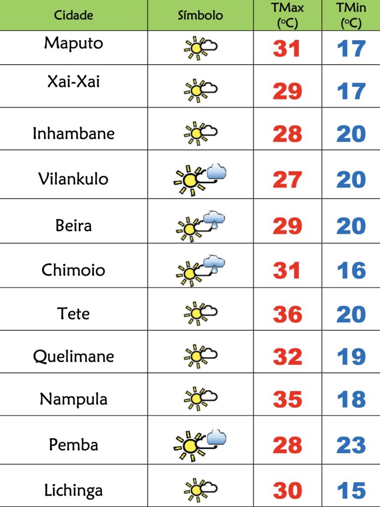 Para as províncias de Tete, Zambézia, Manica e Sofala está previsto céu pouco nublado com períodos de muito nublado; Possibilidade de chuvas fracas locais; Vento de sueste a leste fraco a moderado.
