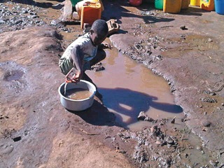Agachado diante de uma poça de água turva, criada pela chuva que caiu no domingo passado (4 de Dezembro), e com uma pequena garrafa de plástico, Abu vai enchendo uma panela. A finalidade é o consumo, apesar de ser imprópria. Mas isso parece não inquietar o rapaz de oito anos, até porque, na lógica do ditado popular segundo a qual “na falta do melhor, o pior serve”, há-de servir para alguma coisa. “Não temos água em casa, o rio fica muito longe”, comentou.
