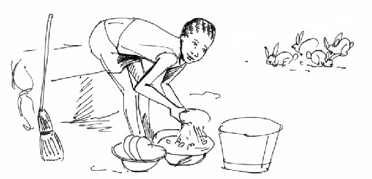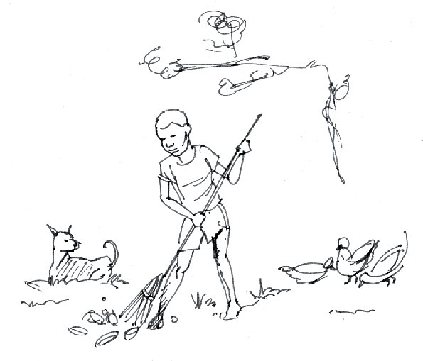 Pior do que isso, depois de voltar para casa, ainda lhe esperam vários trabalhos, dos quais não se pode esquivar. Tem de ir, depois da primeira refeição, que acontece perto das 14h00, controlar os cabritos amarrados na mata. Não é tudo, pois depois vai dar de comer aos porcos que alguém deixou para deles ele cuidar, na residência onde vive com os pais.