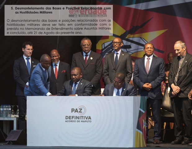 O Acordo de Paz e Reconciliação estipula que até a próxima quarta-feira (21) devem ser desmanteladas todas as bases e posições relacionadas com as hostilidades militares. Também para o dia 21 está agendado o início da sessão extraordinária da Assembleia da República e que tem como principal ponto de agenda a ratificação do novo Acordo rubricado por Nyusi e Momade.