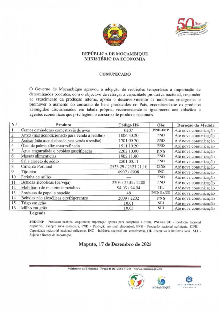 Ainda não estão em vigor, nem tem data para iniciarem, as restrições para importação de carne e miudezas de aves, arroz, açúcar, óleo de palma, água engarrafada, massas alimentícias, sal, cimento, tijoleira, farinha de milho, cerveja, mobílias, papel, trigo e milho em grão, bebidas não alcoólicas e de refrigerantes, anunciadas em 2025 pelo Governo de Daniel Chapo. Por outro lado o Jornal @Verdade apurou que mais do que uma resposta “ao crescimento da produção interna e apoiar o desenvolvimento de indústrias emergentes” as restrições revelam a incapacidade governamental de ultrapassar a crise de divisas em 2026.