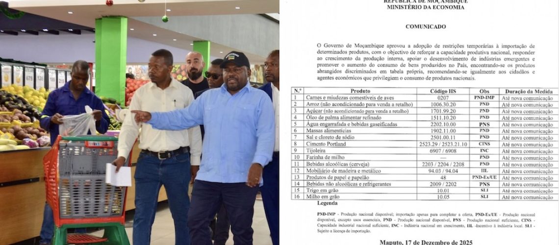 Ainda não estão em vigor, nem tem data para iniciarem, as restrições para importação de carne e miudezas de aves, arroz, açúcar, óleo de palma, água engarrafada, massas alimentícias, sal, cimento, tijoleira, farinha de milho, cerveja, mobílias, papel, trilho e milho em grão, bebidas não alcoólicas e de refrigerantes, anunciadas em 2025 pelo Governo de...