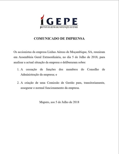 O comunicado o Instituto de Gestão das Participações do Estado (IGEPE) que informa sobre a “cessação de funções dos membros do Conselho de Administração”, e que nem sequer está assinado e carimbado, refere ainda que os accionistas das Linhas Aéreas de Moçambique, SA, que são o Estado com 96 por cento do capital social a a Vintelam com os restantes 4 por cento, deliberaram em Assembleia Geral extraordinária que aconteceu após o incidente com o primeiro-ministro “A criação de uma Comissão de Gestão, para transitoriamente assegurar o normal funcionamento da empresa”.