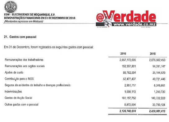 “No decurso do exercício findo em 31 de Dezembro, as remunerações auferidas pelo Conselho de Administração ascenderam a 152.307.801 meticais” pode-se ler no Relatório e Contas de 2016 da EDM.