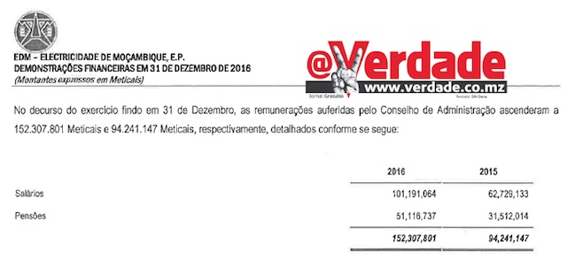 “No decurso do exercício findo em 31 de Dezembro, as remunerações auferidas pelo Conselho de Administração ascenderam a 152.307.801 meticais” pode-se ler no Relatório e Contas de 2016 da EDM.