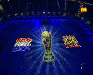 31 dias depois, com 63 jogos realizados apenas duas falta jogar-se a final, e as bandeiras da Holanda e da Espanha aparecem no relvado. E a cerimónia termina com a África do Sul agradecendo em várias línguas, aos adeptos e todos que tornaram possível o sucesso do Mundial, “Obrigado” também se viu escrito no relvado.