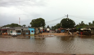 Na rua da Beira, no bairro do Hulene, verificamos uma secção da estrada onde a inundação chega a cerca de um metro de altura.
