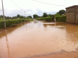 Na rua da Beira, no bairro do Hulene, verificamos uma secção da estrada onde a inundação chega a cerca de um metro de altura.