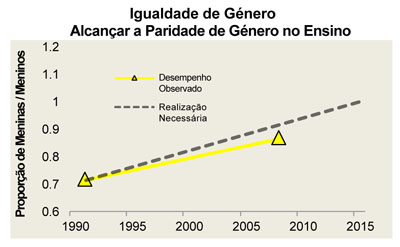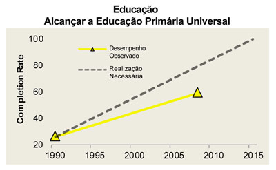 No gráfico acima, a linha tracejada indica a “performance” necessária para o cumprimento desta meta e a linha amarela indica o cumprimento em curso, que está abaixo da meta recomendável. Fonte: World Bank, World Development Indicators 2010