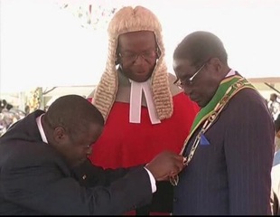 O presidente prestou juramento diante do presidente da Suprema Corte, Godfrey Chidyausiku, de milhares de simpatizantes e de representantes da comunidade internacional, entre eles o Presidente de Moçambique, Armando Guebuza, num estádio de Harare.