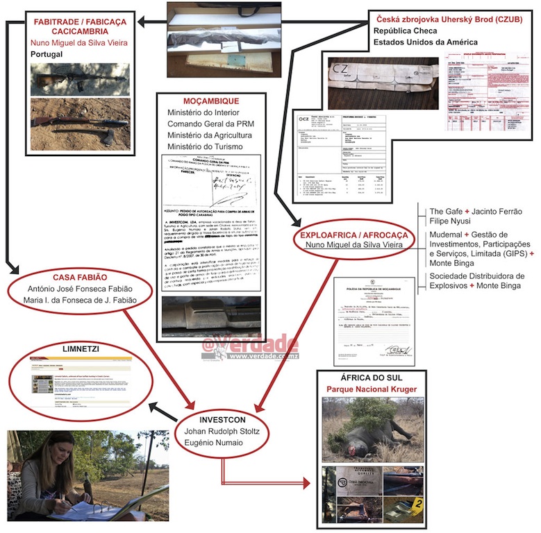 Armas de grande calibre, fabricadas na República Checa, usadas por caçadores furtivos de rinocerontes na África do Sul são adquiridas em lojas de caça em Maputo com a conivência de funcionários de alto escalão nos ministérios do Interior, Turismo e Agricultura. Uma das empresas de armas tem ligações com o Ministério da Defesa, com o SISE e ao filho do Presidente Filipe Nyusi.