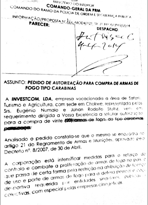 Já a licença das armas que a Investcon adquiriu, e cujo processo normal demora pelo menos 3 semanas, Johan Rudolph Stoltz disse a CAP que as conseguia em menos de 2 horas, pagando subornos. A CAP apurou que grande parte das licenças foram assinadas por Abílio Arnaldo Ambrósio e pelo seu colega Rogerio Moises Chiau, na altura funcionários seniores do Comando Geral da Polícia da República de Moçambique.