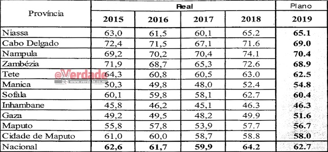 Para este ano a meta era baixar para 59 alunos por turma e quiçá por isso no Orçamento de Estado para 2018 a verba para o sector da Educação tenha alcançado um máximo nominal histórico de 52 biliões de meticais, mais 7,6 que no ano anterior mais ainda assim foram surpreendentes os dados extremamente satisfatórios do Balanço do Plano Económico e Social do 1º Semestre de 2018 que mostrou, em algumas províncias, a descida do rácio para níveis do ensino primário de países do primeiro mundo.