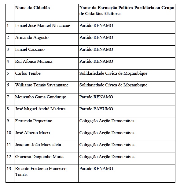 Na assembleia autárquica da cidade de Maputo, trata-se dos cidadãos Ismael José Manuel Nhacucuè, Armando Augusto, Ismael Cassamo [efectivos] e Rui Afonso Munona [suplente].