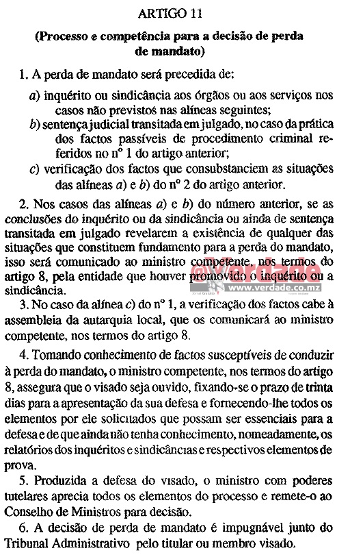 A cláusula em questão, sobre o “processo e competência para a decisão de perda de mandato”, reza que, quando o ministro [no caso concreto a ministra da Administração Estatal e Função Pública, Carmelita Namashulua] toma conhecimento de factos susceptíveis de conduzir à perda do mandato deve assegurar que o visado seja ouvido. Tal não aconteceu.