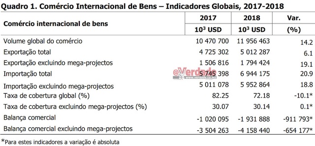 As estatísticas de Comércio Externo mostram ainda que o saldo da balança comercial em 2018 deteriorou-se em 911,7 milhões de dólares, situando o défice em 1,93 biliões de dólares no ano 2018, contra os anteriores 1,02 biliões de dólares norte-americanos em 2017 (o valor mais favorável de sempre).