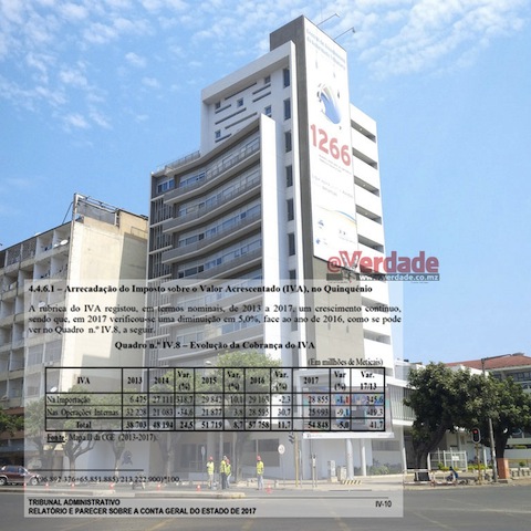 No entanto o Relatório e Parecer do TA sobre a Conta Geral do Estado de 2017 revela que “na componente dos Impostos sobre Bens e Serviços, o IVA não atingiu a meta orçamental prevista, tendo ficado aquém, em 19,2 por cento. Este facto decorre do incumprimento de 14,2 por cento, registado ao nível da sub rubrica do IVA na Importação.”