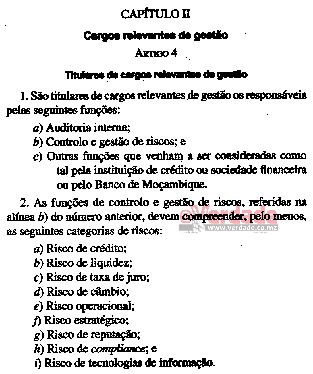 Para além dos órgãos de Administração das instituições de crédito e sociedades financeiras o Banco de Moçambique (BM) alargou a sua vigilância especial aos titulares de cargos de Auditoria Interna e Controlo de risco.