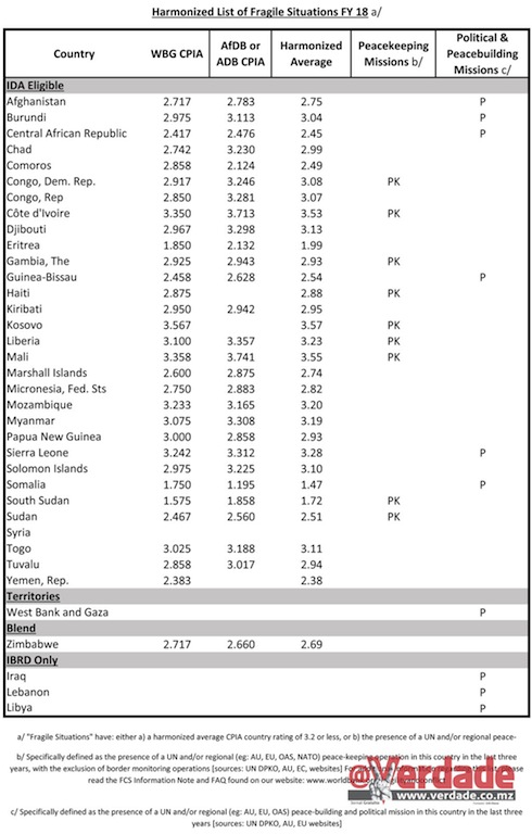 À parte daqueles que onde decorrem missões de Paz das Nações Unidas estão equiparados ao nosso país Myanmar, Papua Nova Guiné e a Serra Leoa. De acordo com o porta-voz do Banco Mundia constar nessa lista significa que a instituição “dará maior atenção ao desenho de intervenções que abordem as causas subjacentes da fragilidade” porém “a inclusão na lista não afectará o nível de recursos da IDA disponíveis para Moçambique, mas permitirá uma maior flexibilidade operacional”.