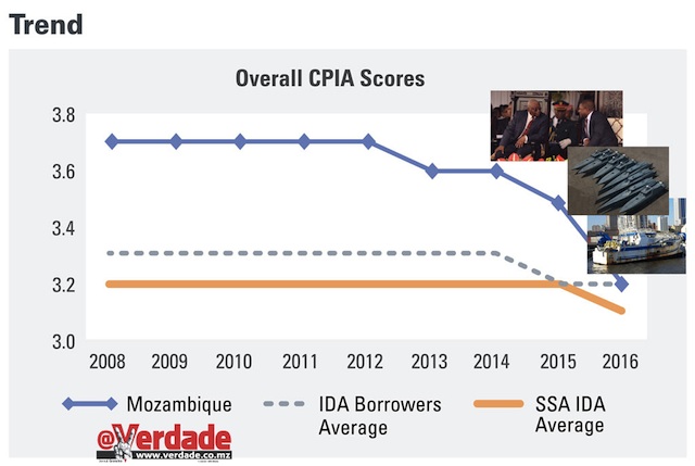 A lista dos Países mais frágeis é elaborada todos os anos a partir da análise de 16 quetisos agrupados em Gestão da Economia, Políticas Estruturais, Políticas para Inclusão Social e Igualdade e também a Gestão do Pública assim como das Instituições do Estado. Moçambique que está em retrocesso nesta lista desde 2013 regrediu de 3.5 em 2015 para uma pontuação de 3.2 durante o ano de 2016. Os quesitos que contribuiram para a descida de Moçambique foram a política monetária(passou de 4 para 3.5), a política fiscal(desceu de 4 para 3), o sector financeiro(caiu 3.5 para 3) e a política de gestão da Dívida Pública(que regrediu de 3.5 para 2.5).