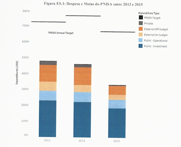 Além disso, “a despesa não atingiu as metas do PNISA em nenhuma das três áreas cobertas por este estudo, caindo 66 por cento da meta do PNISA em 2013 para 60 por cento em 2014 e 50 por cento em 2015”.
