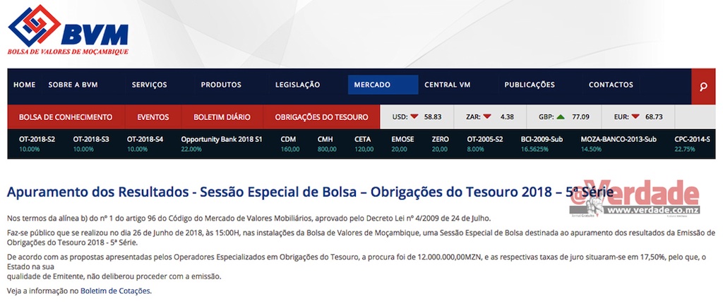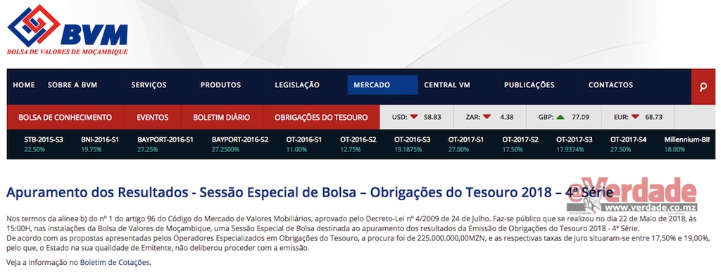 A 22 de Maio o Executivo colocou na Bolsa de Valores de Moçambique (BVM) a 4ª Série de Obrigações do Tesouro 2018 para obter 1,5 bilião de meticais. A procura ficou por 225 milhões de meticais, com taxas de juro de 17,50 e 19 por cento, e o Estado “não deliberou proceder com a emissão”, pode-se ler no comunicado da BVM.