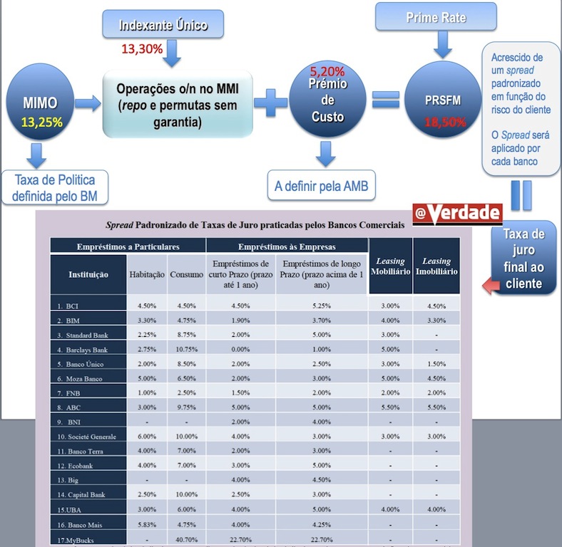 “O Rating do país, em função daquilo que é classificação de Moçambique pelas agências notação financeiras, Moçambique está no risco mais baixo, lixo; temos o Rácio do Crédito em Incumprimento ou crédito mal parado, neste momento em torno de 11 por cento, e é uma componente que entra para o custo dos bancos. Para além disso temos o Rácio do Crédito Saneado; existe ainda Coeficiente de Reservas Obrigatórias que é definida pelo Banco de Moçambique em sede do Comité do Política Monetária, que é aquela parcela que o BM”.