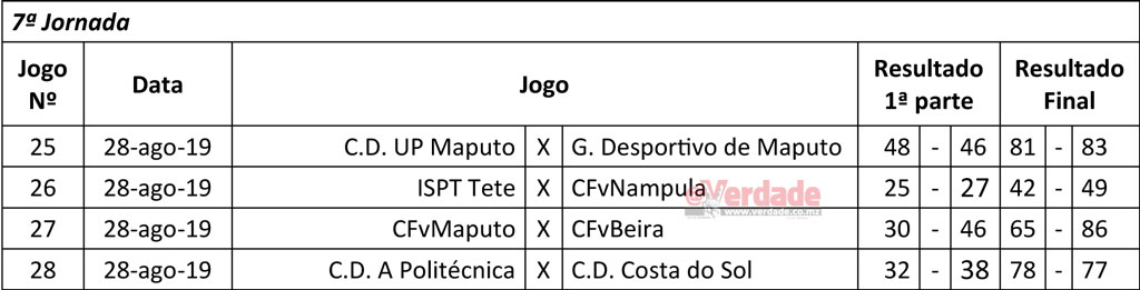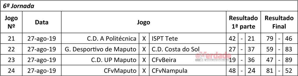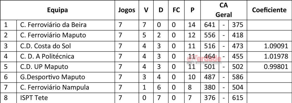 O Ferroviário de Maputo, que além da derrota contra o homónimo da Beira perdeu também para a Universidade Pedagógica de Maputo, ocupa o 2º lugar seguido pelo Costa do Sol, que na última jornada perdeu com a A Politécnica, 78-77 pontos.