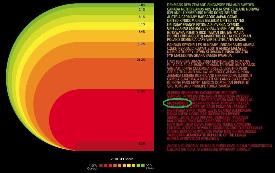 O Botswana, as Ilhas Maurícias, Cabo Verde, as Ilhas Seicheles e a África do Sul constituem os cinco países africanos menos corruptos, segundo o Índice de Perceção da Corrupção (IPC), divulgado terça-feira pela Transparência Internacional (TI), neste índice Moçambique ocupa o 116° lugar que, apesar da evolução do anterior 130º, indica que o nosso país continua longe de vencer a luta contra a corrupção estando no mesmo patamar que a Mongólia, a Tanzania ou a RD Congo.