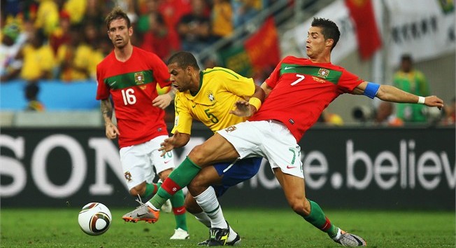Nos primeiros minutos da partida viu-se um equipe de Portugal a marcar muito em cima, sobretudo pelo lado esquerdo da defesa, e tentar sair em contra-ataque. O Brasil coxo na esquerda atacava justamente pelo flanco melhor protegido por Fábio Coentrão, nem Daniel Alves nem Maicon conseguiram espaços para irem a linha e cruzar.
