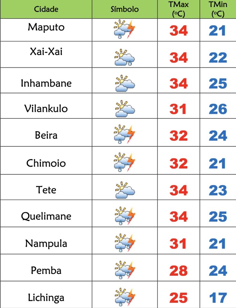 Para as províncias de Tete, Zambézia, Manica e Sofala está previsto céu geralmente muito nublado; Chuvas fracas a moderadas localmente fortes e acompanhadas de trovoadas; Vento de noroeste a nordeste fraco a moderado, soprando por vezes com rajadas locais.