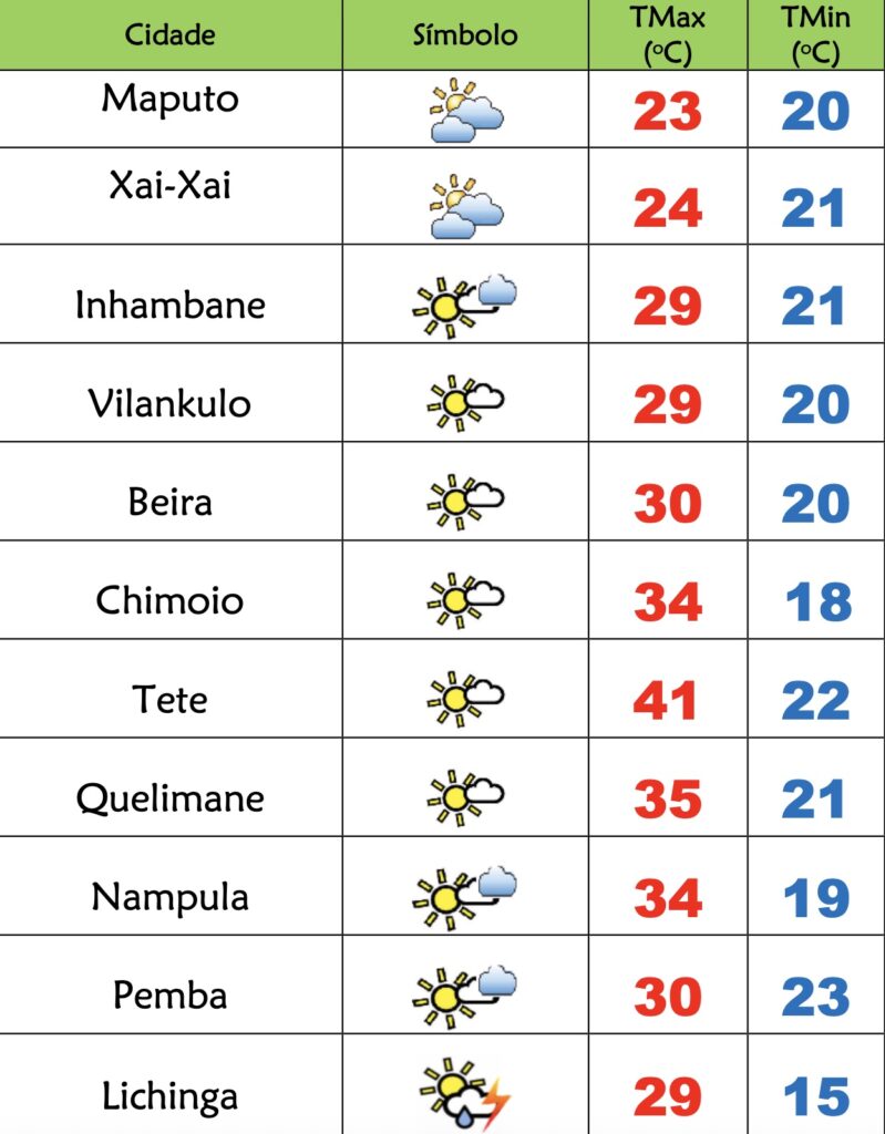 Nas províncias de Inhambane, Gaza e Maputo o INAM prevê tempo ameno a fresco, com o céu limpo passando a muito nublado em Maputo e Sul de Gaza; Possibilidade de trovoadas e aguaceiros fracos locais; Vento de nordeste a noroeste fraco a moderado, rodando para sueste e soprando por vezes com rajadas.
