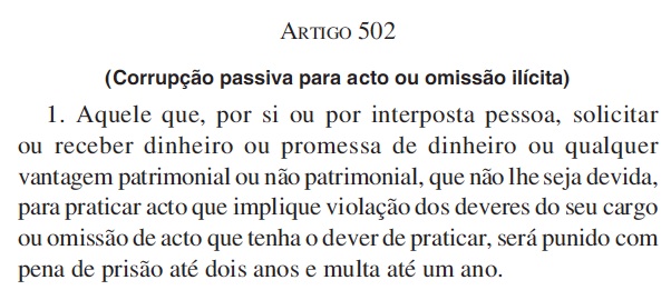 Na generalidade os réus deste processo são acusados de terem praticados os seguintes crimes, que para a defesa nunca existiram: PRIMEIRO, corrupção passiva para acto ou omissão ilícita, previsto e punido pelo artigo 502 n.º 1 do actual Código Penal (CP);