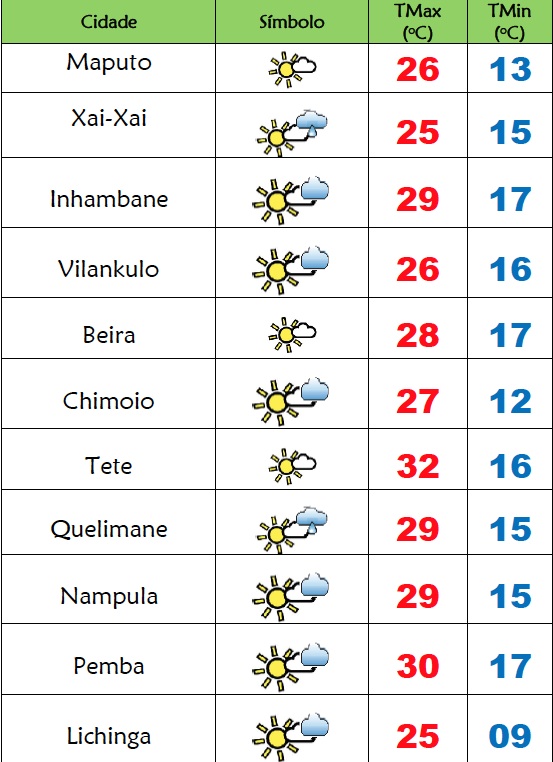 Nas províncias de Inhambane, Gaza e Maputo o INAM prevê céu pouco nublado passando a muito nublado; Possibilidade de chuviscos dispersos; Neblinas e nevoeiros matinais locais; Vento de nordeste a sueste fraco a moderado soprando por vezes com rajadas.