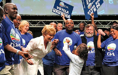 Mas o COPE não é o único partido que desafia a maioria de 2/3 do ANC no Parlamento. Também a Democratic Alliance (DA), até agora a oposição oficial ao ANC, surge com aspirações renovadas. Com 12,37% do total de votos a nível nacional em 2004, esta coligação, que teve origem no antigo Democratic Party, de Tony Leon, – a única oposição tolerada pelo regime do apartheid – é a única que hoje contraria a hegemonia nacional do ANC, detendo o Governo da província do Cabo Ocidental. Aliás, na presente campanha eleitoral, a sua líder, Helen Zille, presidente do município do Cabo, já afirmou que espera obter pelo menos 50% dos votos nesta região, conservando o governo provincial. A DA debate-se sobretudo com um estigma: fazer cair a máscara de partido defensor da classe branca privilegiada. Enquanto isso não suceder, se é que algum dia irá suceder, será muito difícil atrair parte substancial do eleitorado negro – 80% dos votantes – decisivo para a conquista de uma vitória nas urnas.