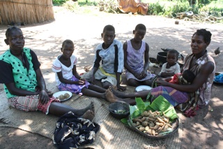 Ao fim de dez minutos de caminhada, aproximamonos de duas palhotas e deparamos com um agregado familiar constituído por sete pessoas, chefiado por Maria Francisco Tivane. A família está reunida para o almoço, se é que se pode considerar como tal uma porção de batata-doce cozida.