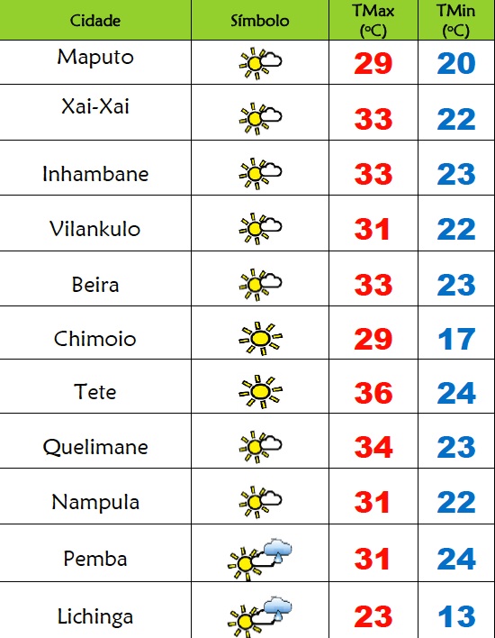 Para as províncias de Tete, Zambézia, Manica e Sofala está previsto tempo quente, com céu predominantemente limpo; Possibilidade de ocorrência de neblinas e nevoeiros matinais; Vento de nordeste com intensidade fraca.
