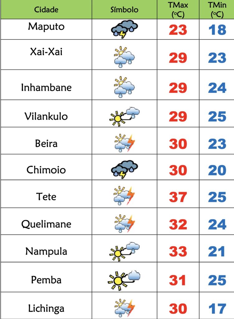 Eis as temperaturas previstas para este domingo(16), 1288 dia em Emergência de Saúde Pública em Moçambique: