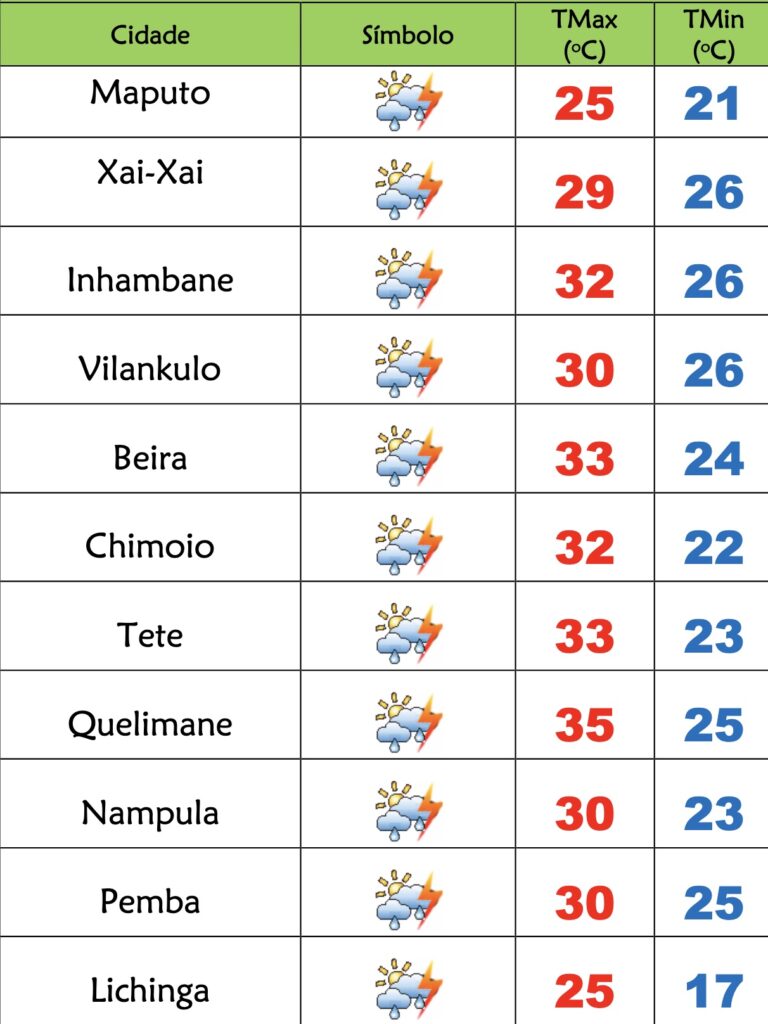 O Instituto Nacional de Meteorologia(INAM) prevê o seguinte estado do tempo para esta quinta-feira(18), Dia em que o Presidente Daniel Chapo apresenta, na Assembleia da República, na Cidade de Maputo, o seu 1º Informe Anual sobre a Situação Geral da Nação.