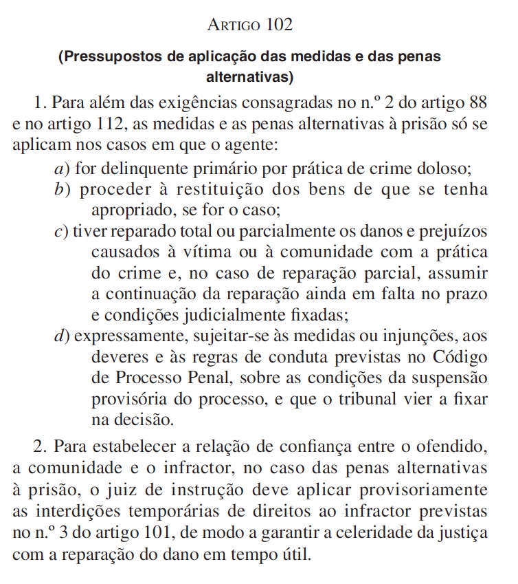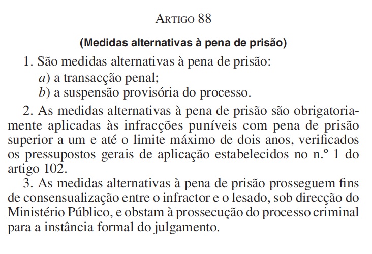 Segundo o juiz, o “Código Penal, no artigo 88 prevê como medidas alternativas a transacção penal e a suspensão provisória do processo, ambas a serem definidas no Código do Processo Penal como a faculdade do Ministério Público não prosseguir a acção penal contra o infractor, desde que este preencha os pressupostos fixados na lei, isto para o caso da transacção penal.”