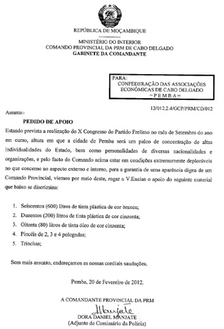 Aliás na carta que tivemos acesso daquela instituição solicitando apoio a Confederação das Associações de Cabo Delegado assinada pela número um da PRM, Dora Manuel Manjate, adjunto Comissário da Polícia e datada de 20 de Fevereiro do presente ano de 2012, refere que: “estando previsto a realização do X congresso do partido Frelimo no mês de setembro do ano em curso, altura em que a cidade de Pemba será um palco de concentração de altas individualidades do Estado, bem como personalidades de diversas nacionalidades e organizações e pelo facto de o comando acima estar em condições estremamente deploraveis no que concerne nos aspectos externo e interno, para a garantia de uma aparência digna de um comando Provincial, viemos por este meio deste, rogar a V.excia o apoio do seguinte material”.